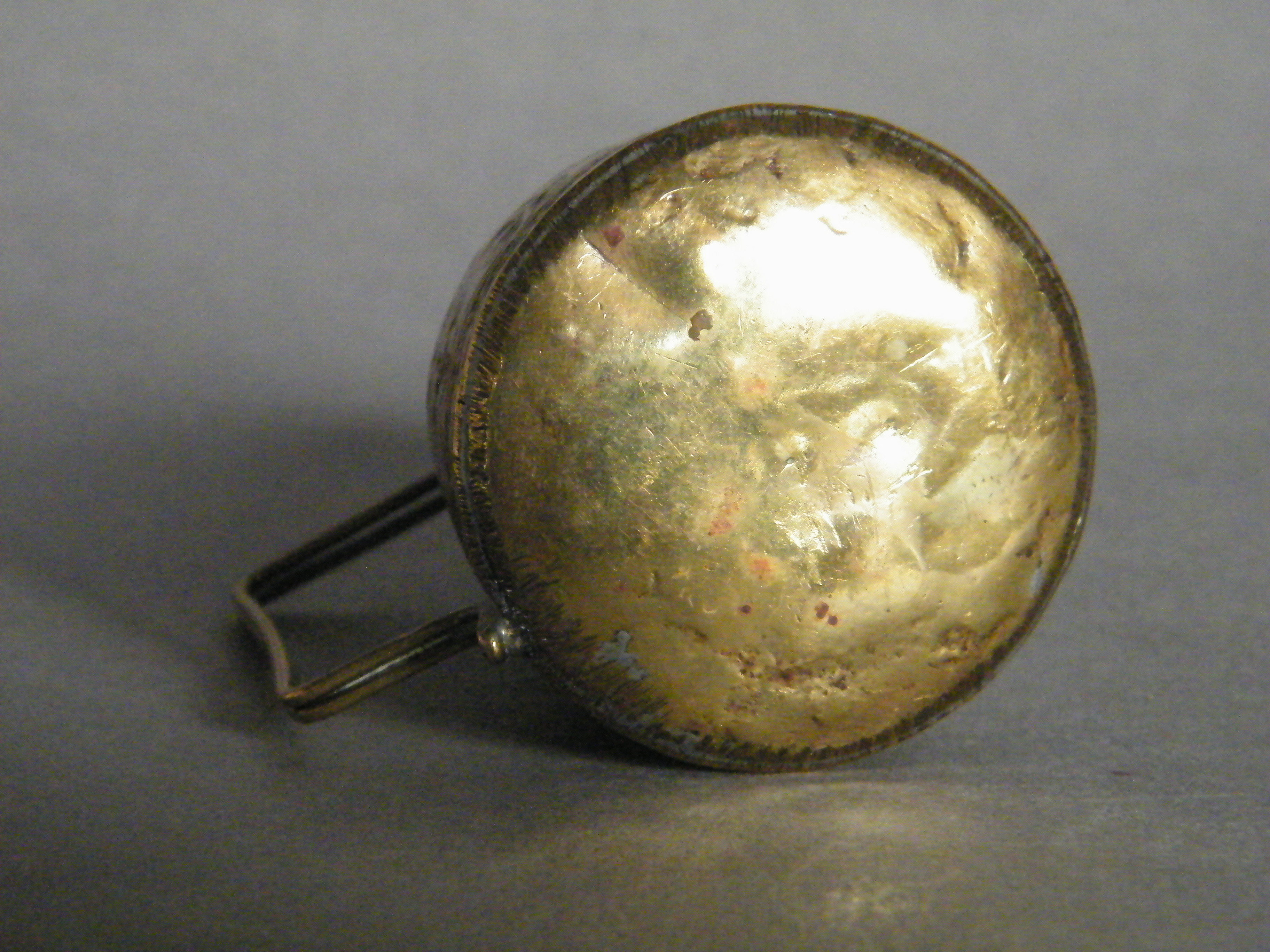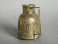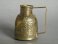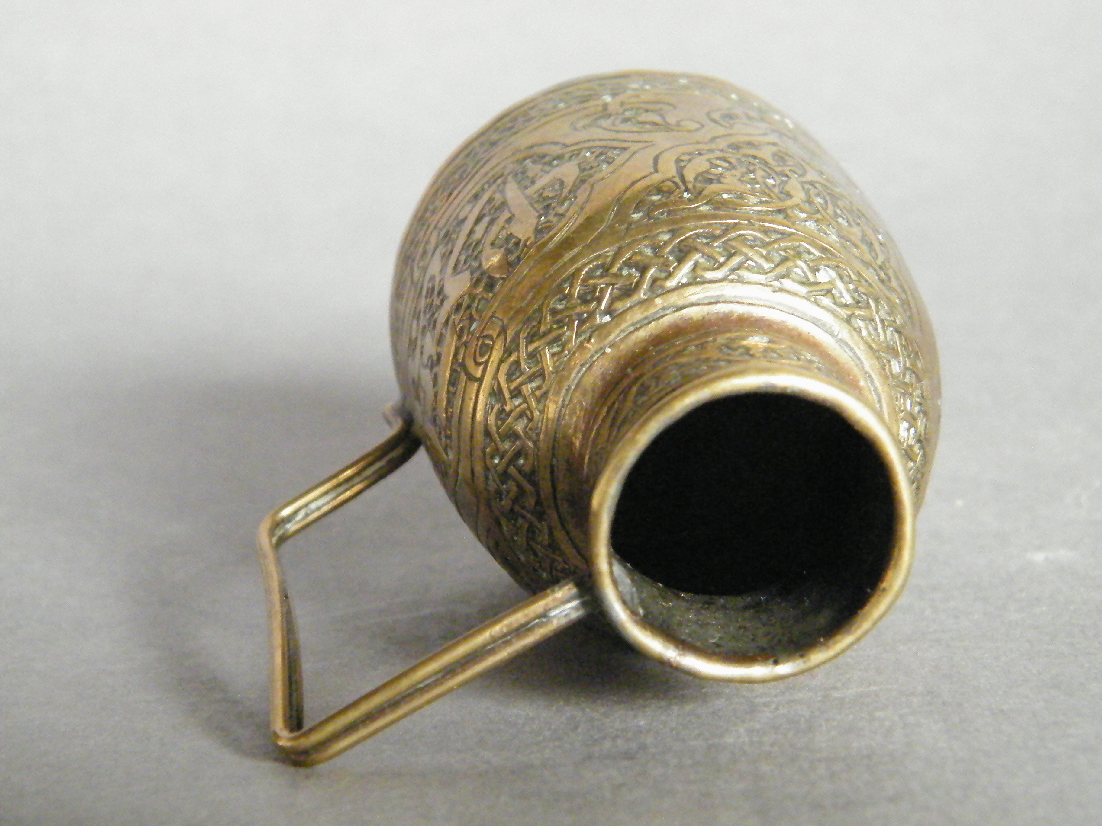 A miniature brass pitcher hand engraved in Mamluk style with traditional design motifs incorporating Arabic calligraphy within two cartouches.