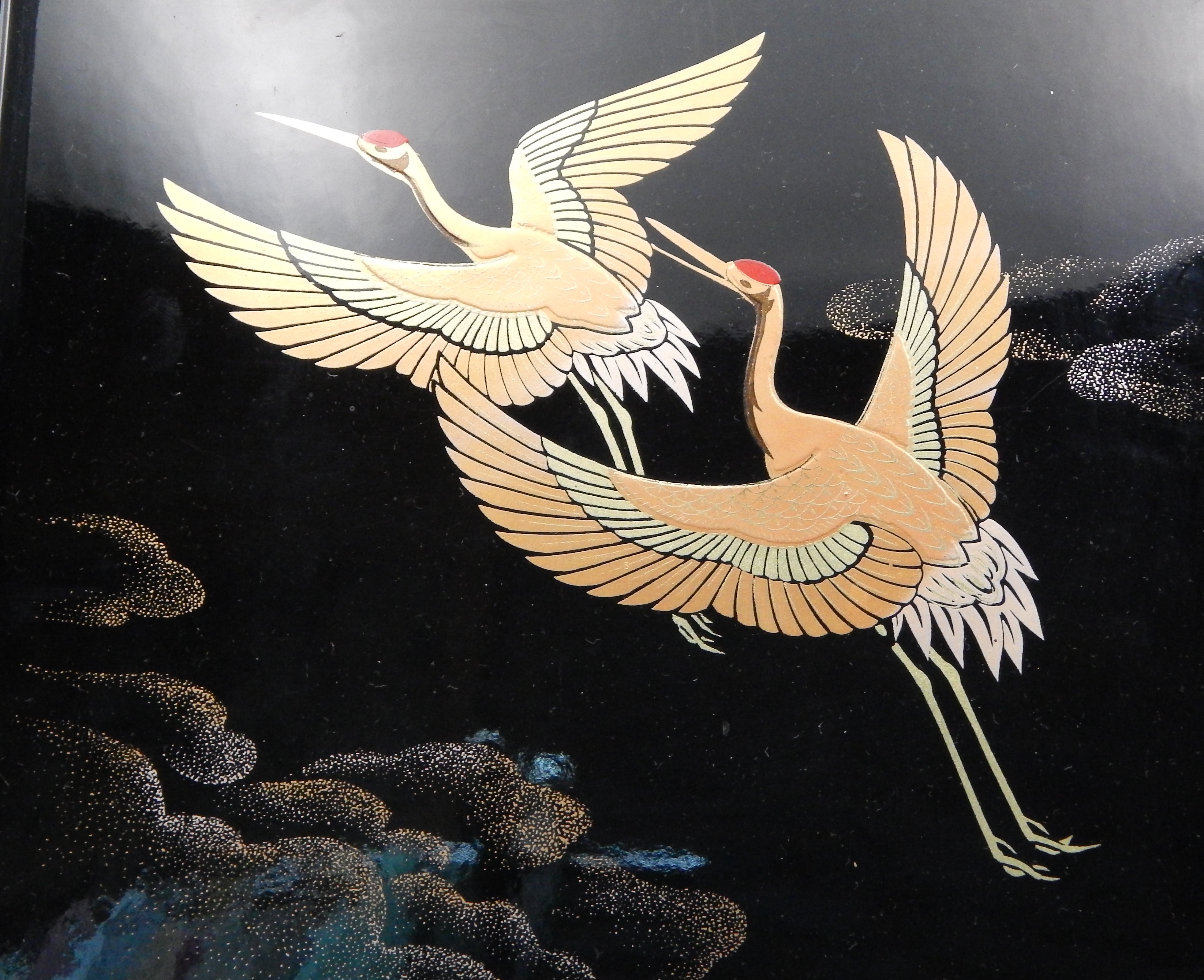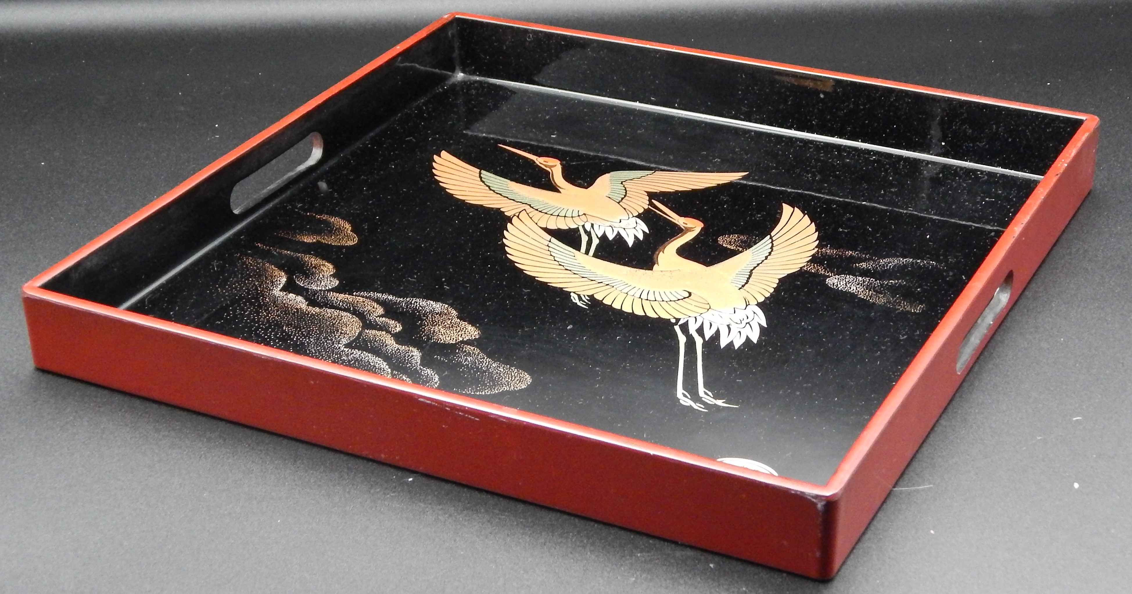 A Japanese tray painted with gold lacquer in traditional style depicting two cranes in flight, made circa 1960 - 1990