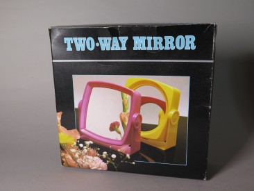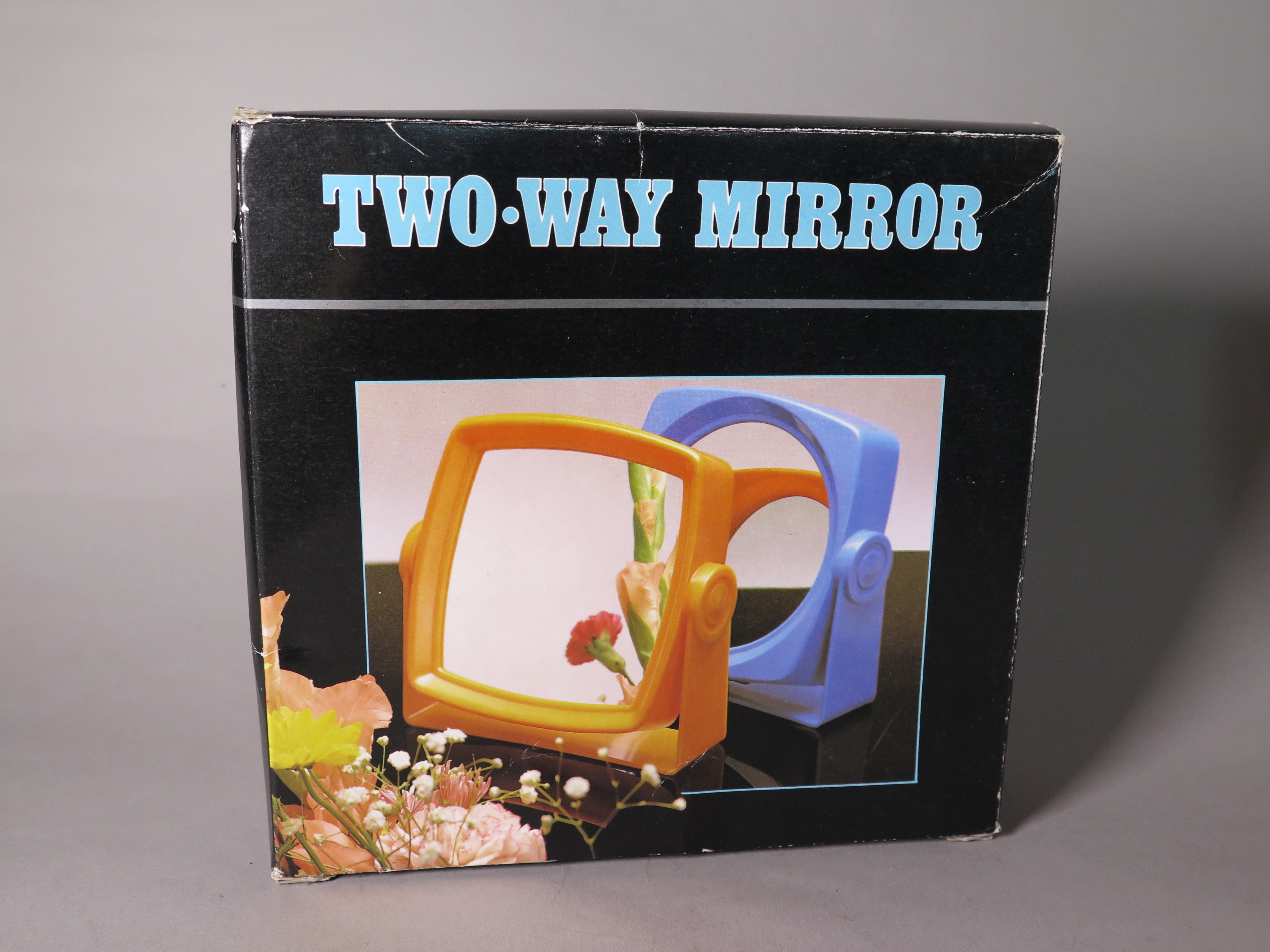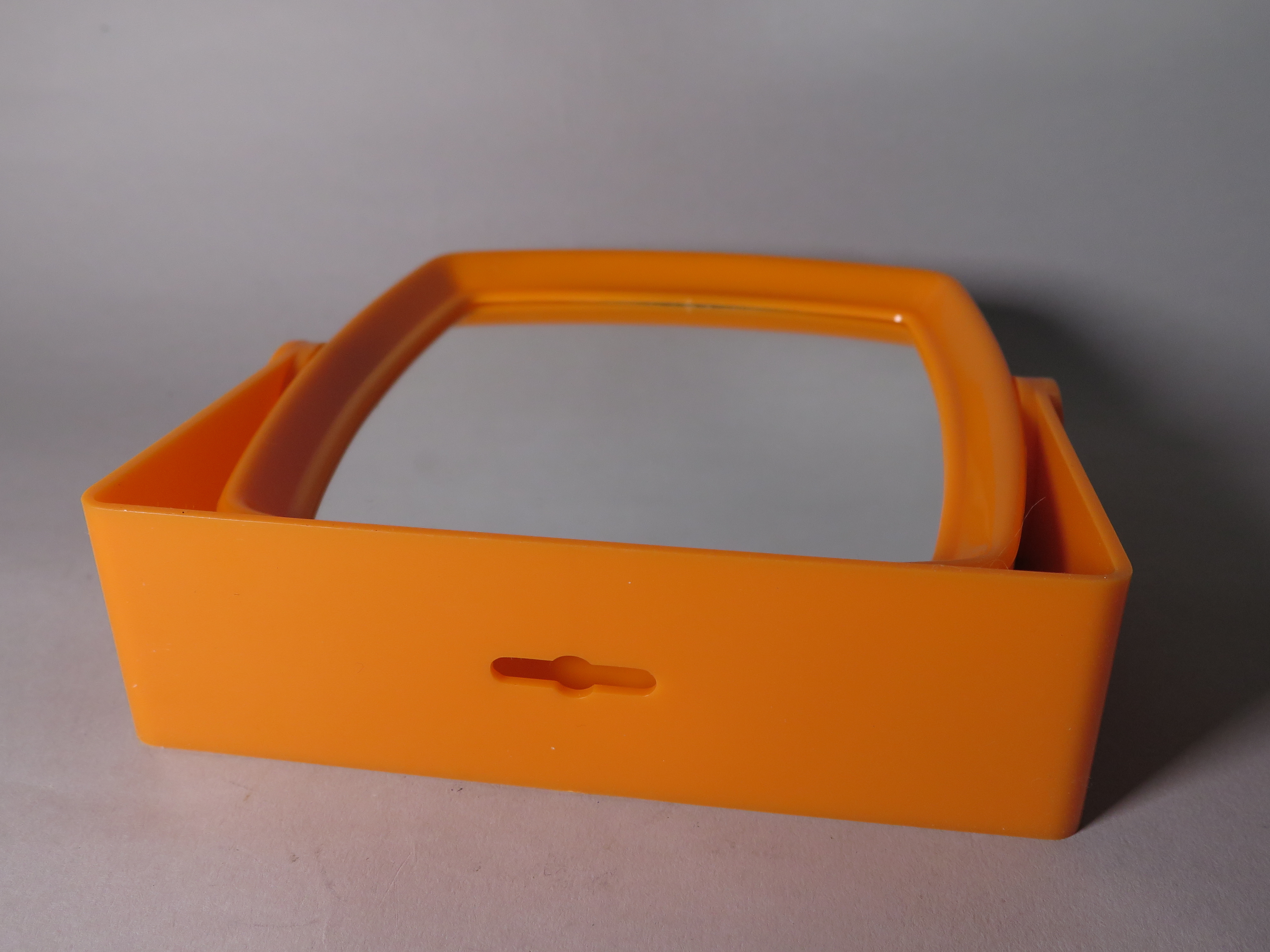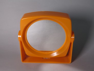 An optimistically described "two way" (double sided) free standing or wall mountable mirror in typical 1960s bright orange plastic.