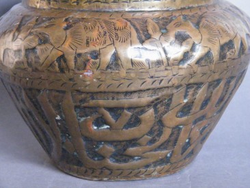 A relief decorated brass vase made in Syria in the 19th Century. Similar, more recently made, vessels decoratively customized to Western taste, are pictured in the 1907 catalogue of the Army and Navy Co-operative Society (department store) and in the 1913 Christmas catalogue of A.W. Gamage Ltd (Gamages) of Holborn, London described as "Syrian raised Brass Heart Shape Fern Pot No.X.2"; and also