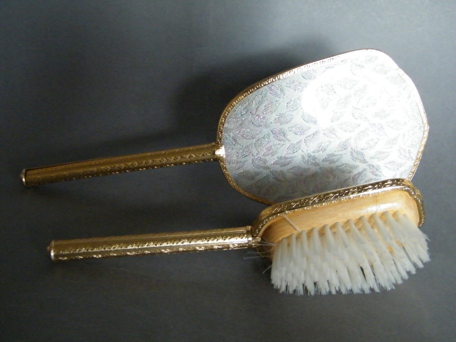 A dressing table set comprising Clothes Brush "Vanity" Hand Mirror,Comb and, unusually, a matching Alarm Clock. This item was probably made circa 1960 - 1965.