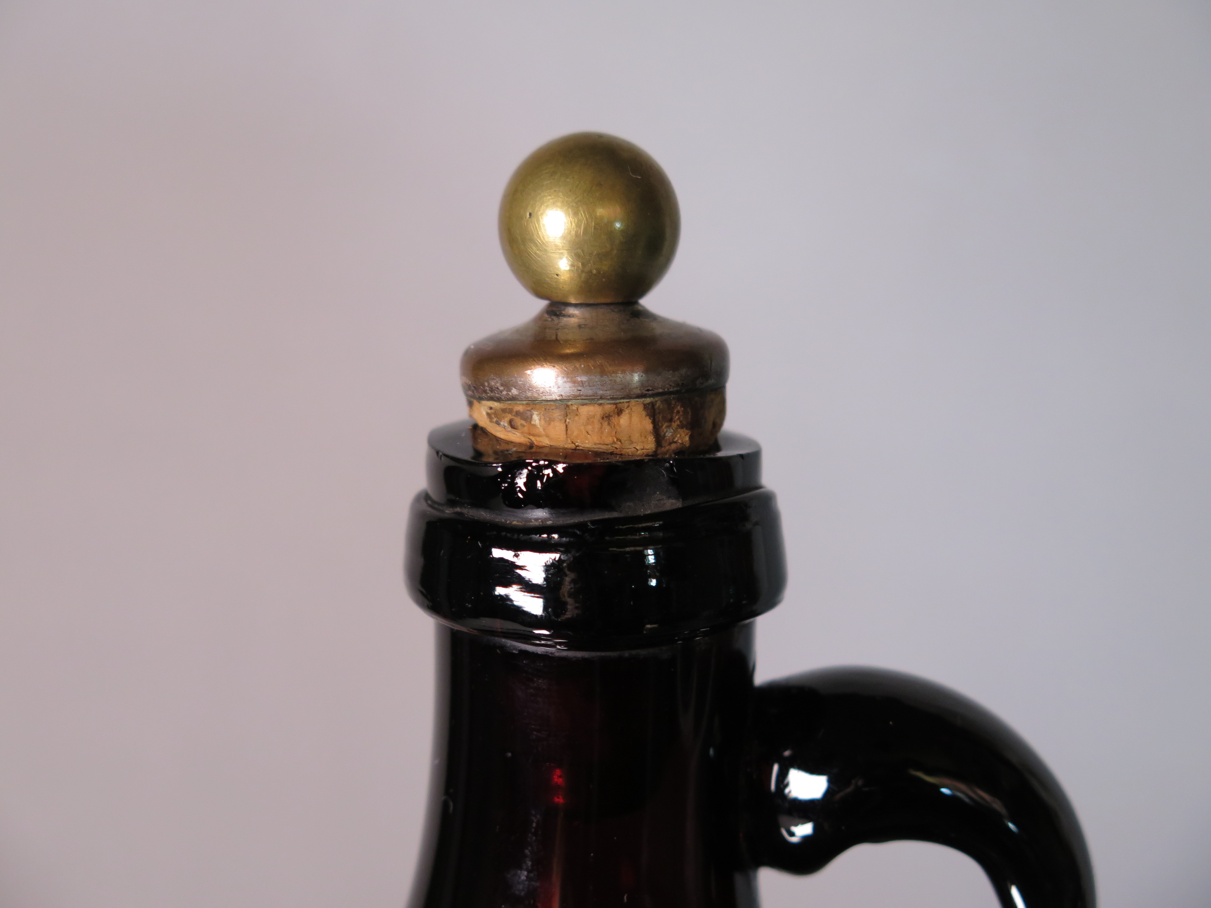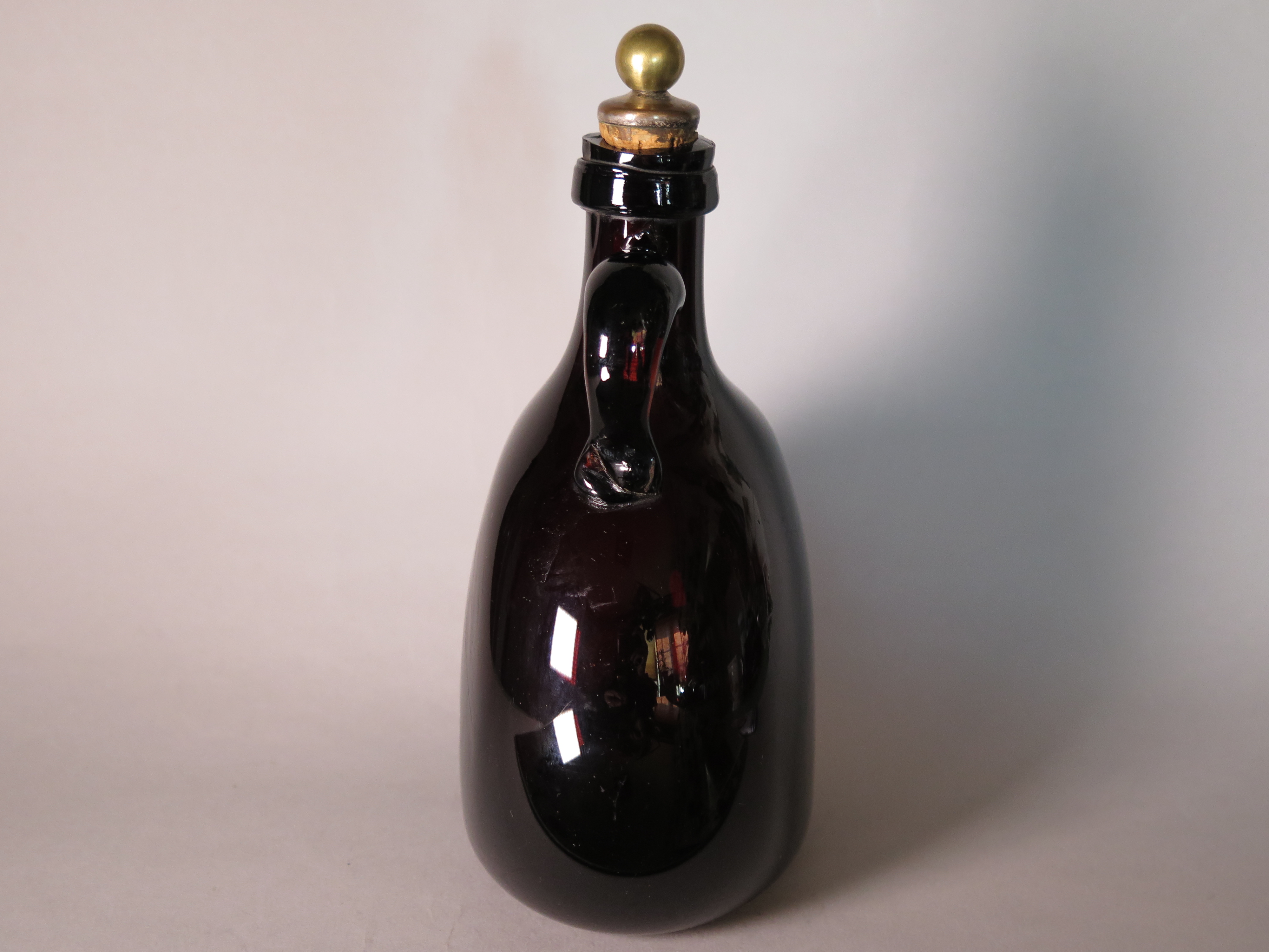 An early 19th Century late Georgian brown glass drinks flagon with narrow neck, swollen body,depressed base, loop handle and complete with original cork stopper.