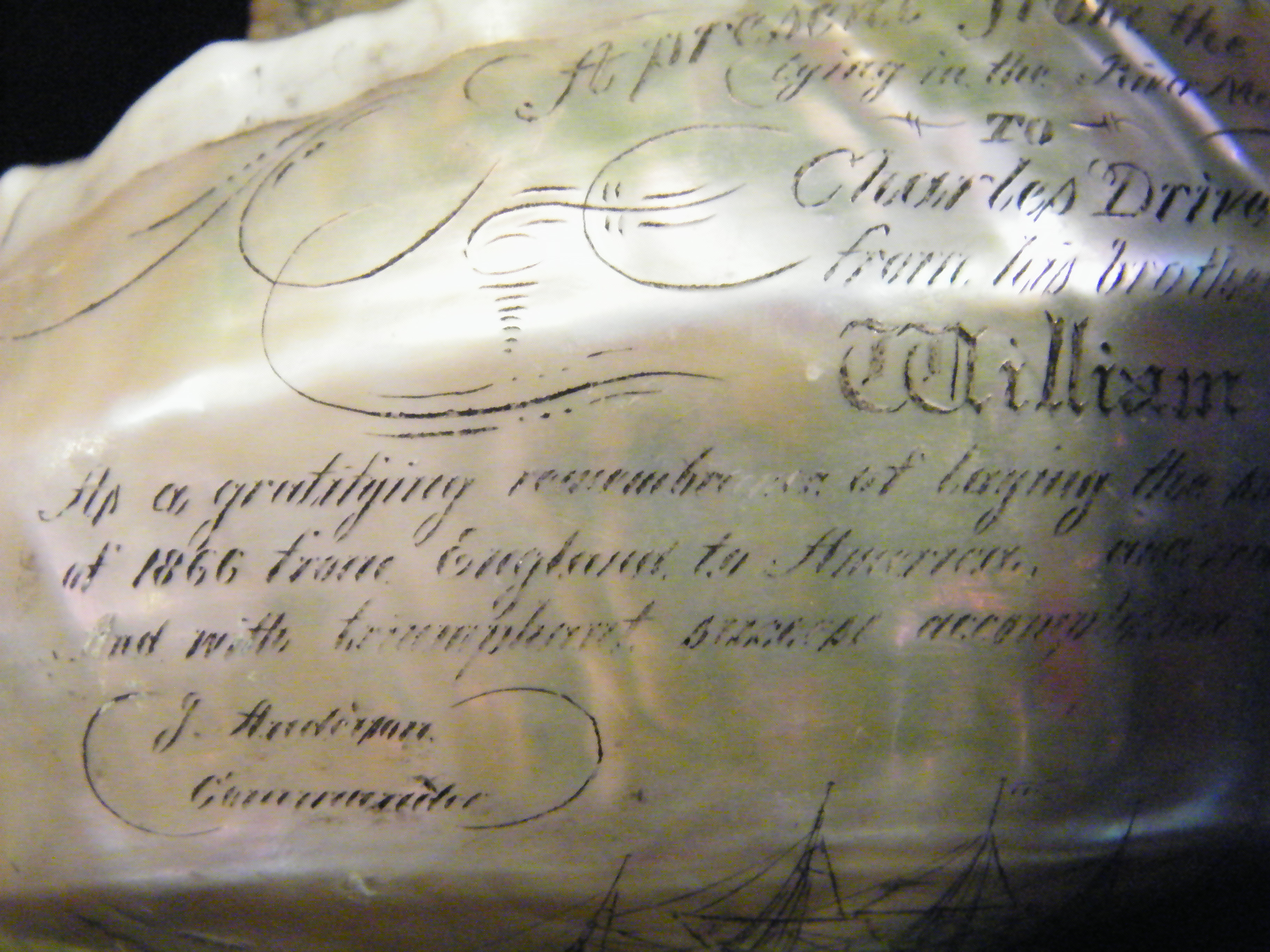 #1673  Victorian Transatlantic Telegraph Cable Commemorative "Scrimshaw" Shell S.S. Great Eastern, circa 1866  **Sold**  February 2018