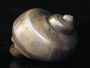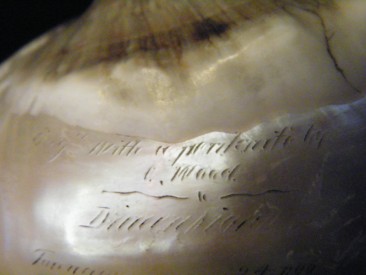 A rare dedicated souvenir "Turban Shell" (Latin: Turbo Marmoratus) hand engraved, onboard ship, "with a penknife" by C H Wood.