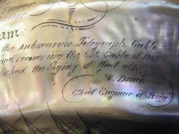 This presentation piece was commisioned by the ship's Chief Engineer William Driver, for his brother Charles in 1866, to commemorate the laying of the transatlantc telegraph cable.